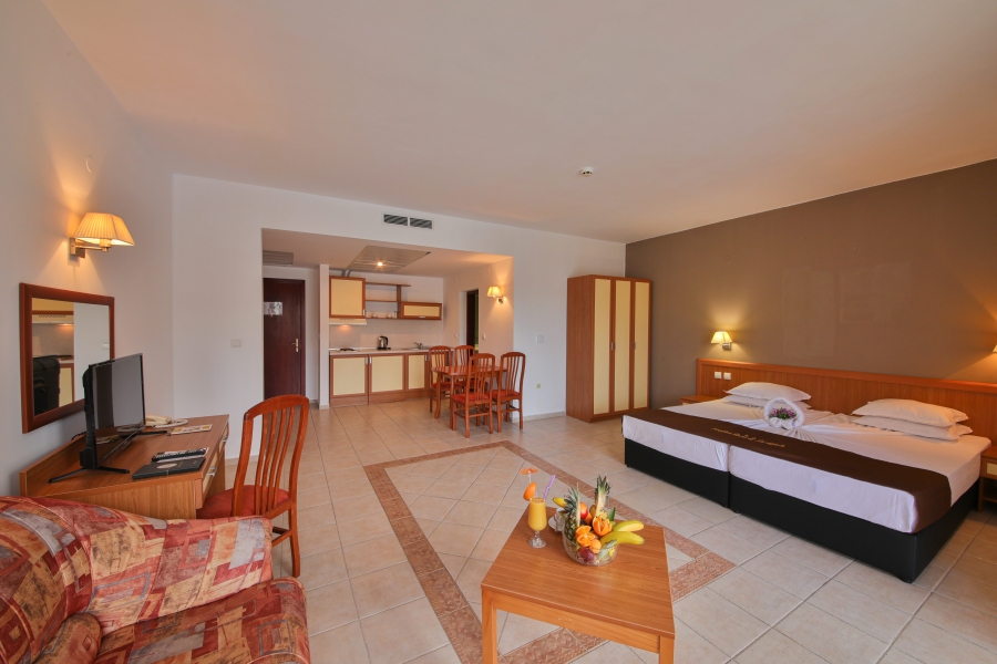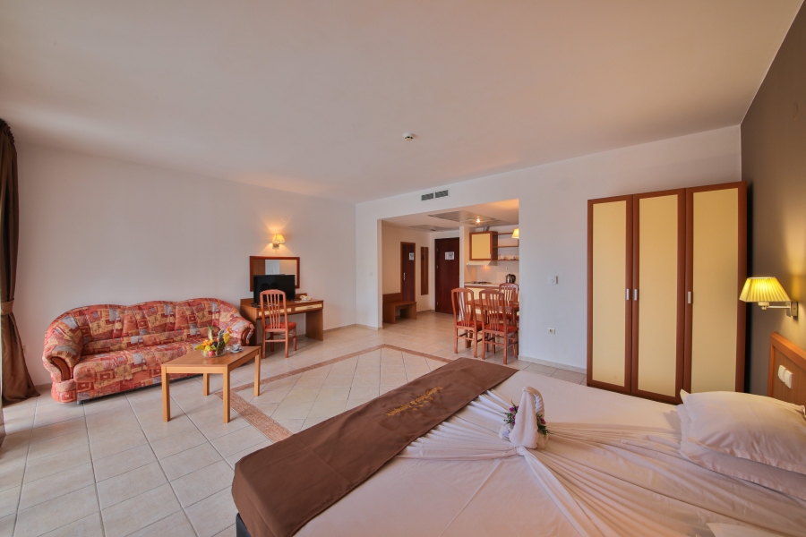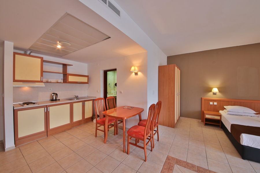 Просторните студиа, оборудвани с кухненски бокс, кът за отдих и спалня с две легла, са привлекателна комбинация от комфорт и практичност.